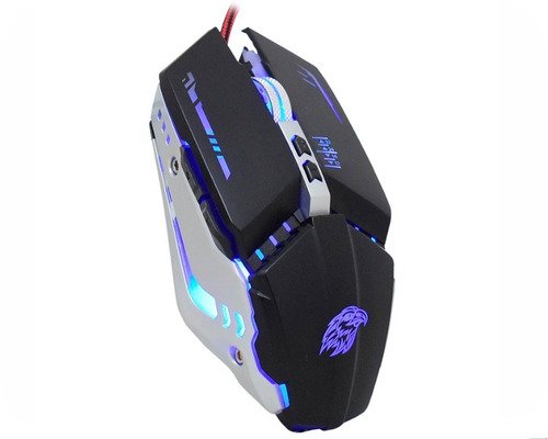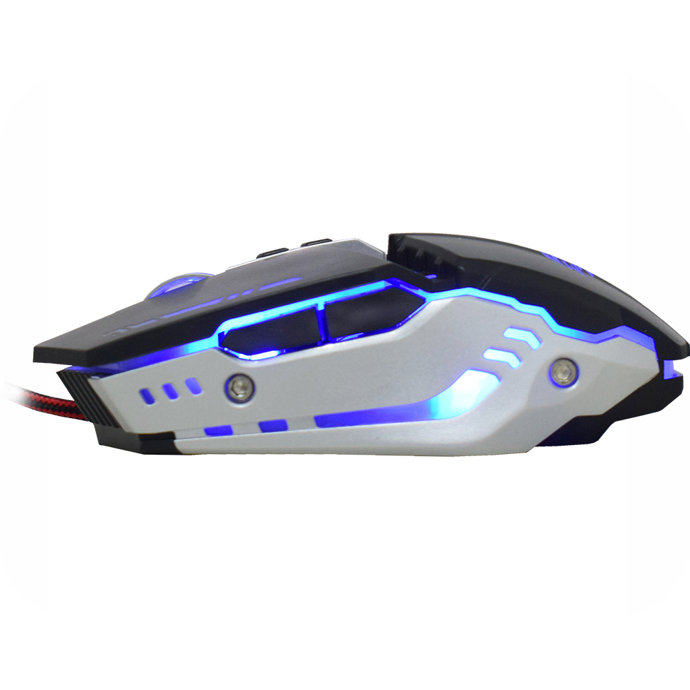 Mouse óptico de 07 botões, com ajuste de DPI de 800-1600-2400-3200 e LEDs com alteração automática nas cores azul, roxo, rosa e vermelho.